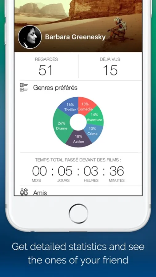 Connect with your Facebook account and join all your friends on the app. Discover the movies they watch and give your advice on the movies you watch. Get detailed statistics (prefered genres, total time spent watching films, etc).