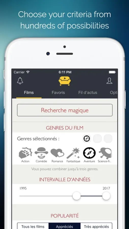 Through its search system, it will offer movies that fit your taste. You can search by genre, year, popularity, origin, director, actor, keyword, or all this together! You can then browse the results in a very intuitive way.