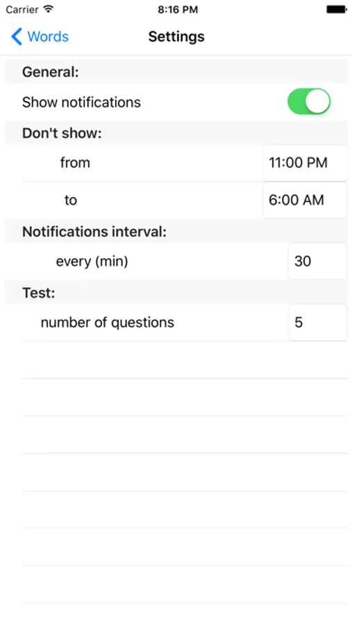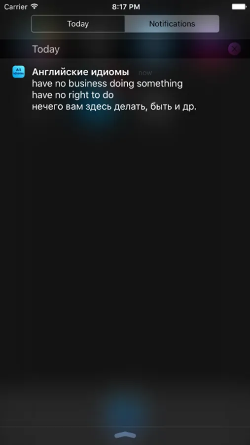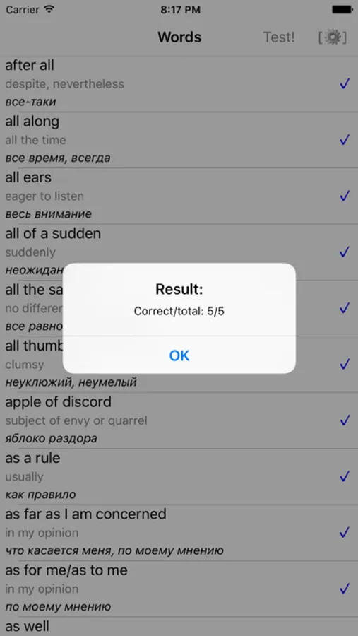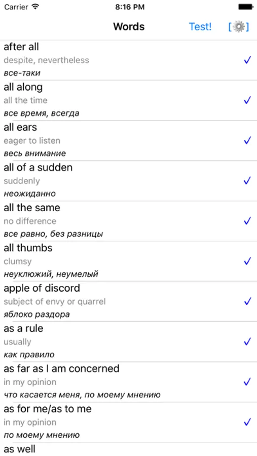Это приложение поможет легко выучить идиомы английского языка с помощью уведомлений, отображаемых через настраиваемые промежутки времени, а также теста, который поможет проверить свои знания на выбранном количестве случайных слов. Полный список включает более 300 самых популярных английских идиом с переводом на русский и словами-синонимами. По мере запоминания, с выученных выражений в списке можно снимать отметку показа, чтобы больше не получать их в уведомлениях и тесте.