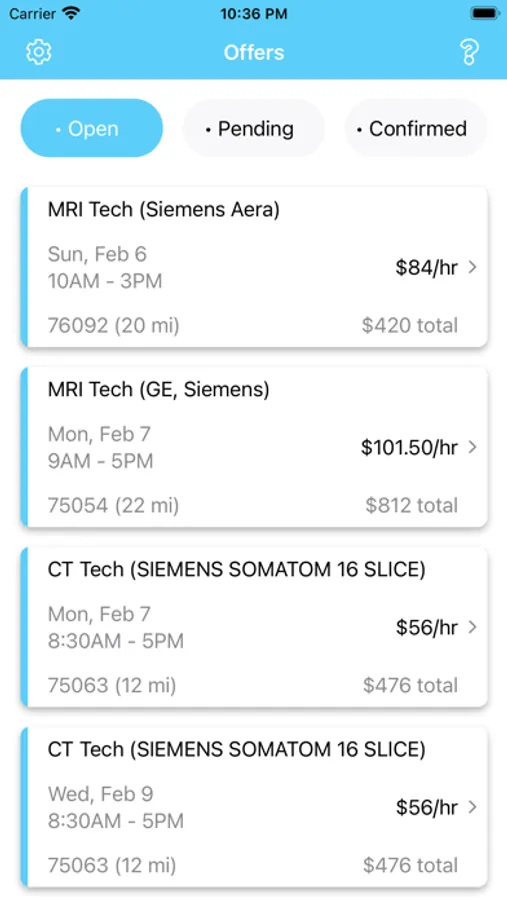 Shift Listing (single and multiple shift needs) showing skill, equipment, date, hours, and the rate for open, pending, and confirmed shifts.