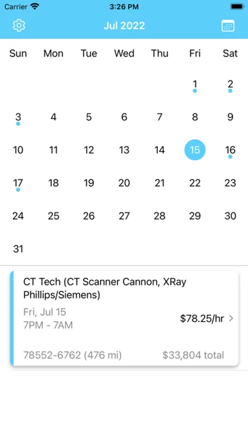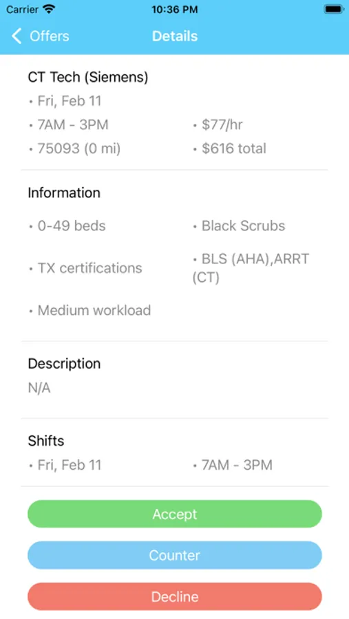 Detail screen showing skill, equipment, rate, date, hours, facility size, dress code, certifications, registrations, workload, and other pertinent information for the shift selected.