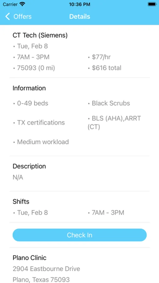 Final Detail screen showing above, plus actual address of facility and who to report to at the facility. Also on the final detail screen is the “Check In” feature, which notifies PRNPool you have reached the assignment.