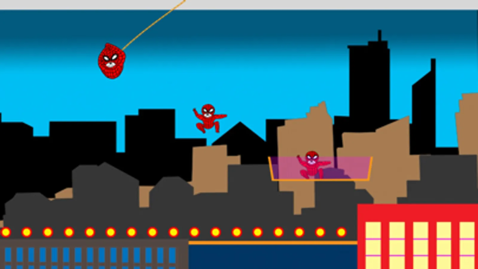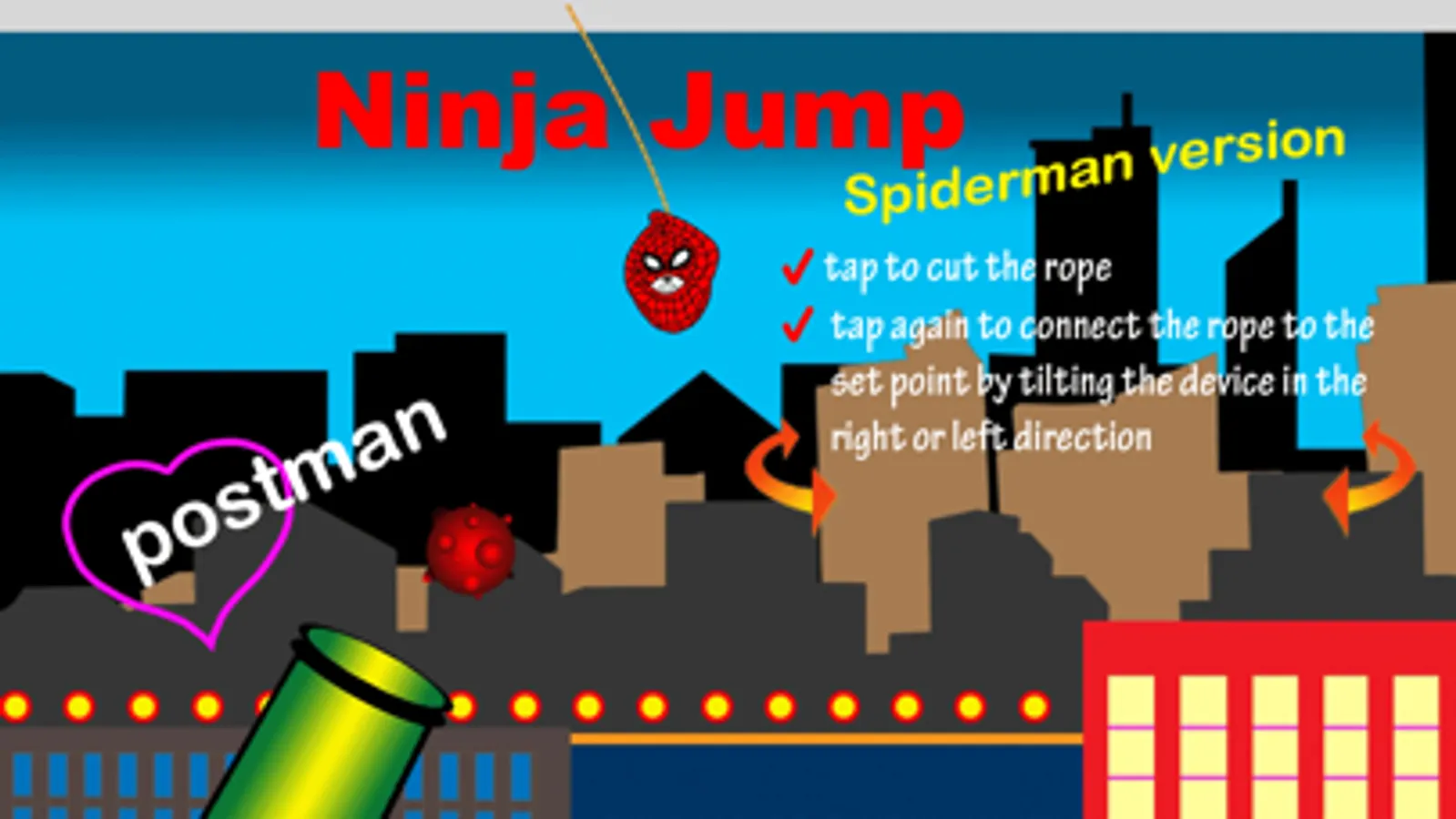 'Ninja Jump - Spiderman version' is the game where a Ninja jumps and flies, in high speed, avoiding a lot of obstacles from building to building and arrives at the finish line in the fastest time.