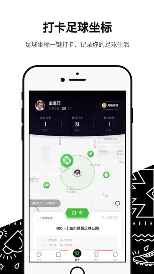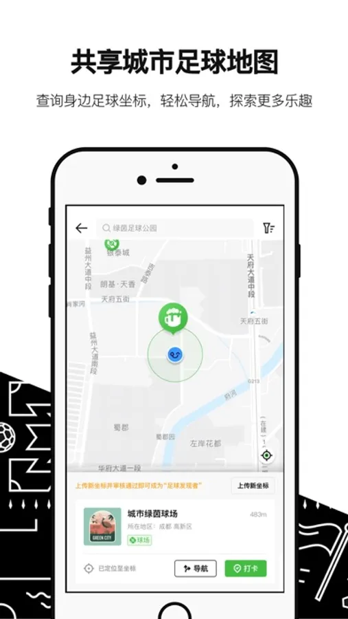 每当到达一处足球坐标,都可开启绿茵岁月进行一键打卡。每一次打卡都是你足球生活的点滴记录。你还可以将打卡成功后的分享卡,分享到微博、微信、朋友圈,与更多的人分享你对足球、对生活的热爱。