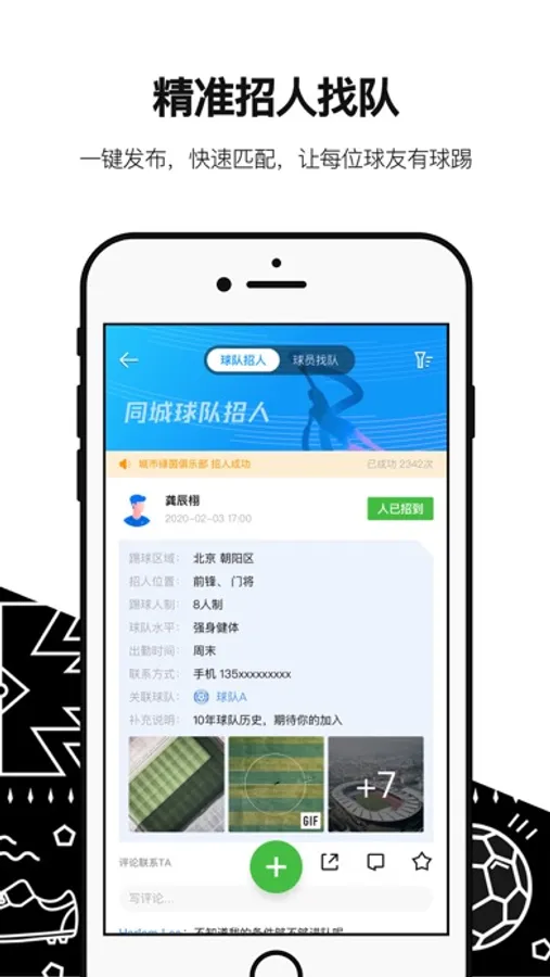 无论你想找队,还是你的球队想要招人,都可以在这里发布招募信息,系统会根据你的需求,快速匹配,精准推荐;同时你也可以在大量球队招募、球友自荐中,自由挑选,主动联系。