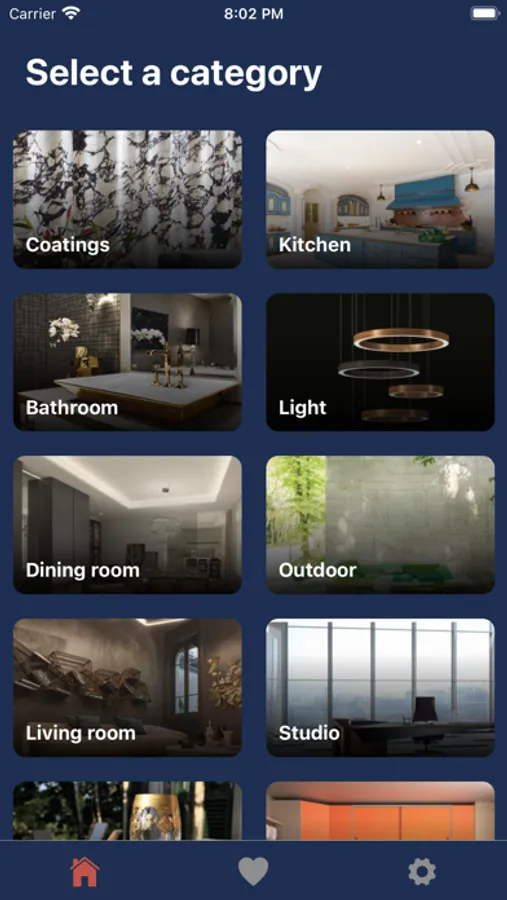 For convenience, the app is divided into zones. Here you will find many ideas for living rooms, kitchens, bedrooms, bathrooms, offices. In addition, we have added sections for outdoor items, swimming pools, lighting and sports equipment. A special section was dedicated to materials for interior decoration made of wood, marble, mosaic. The latter area includes textile.