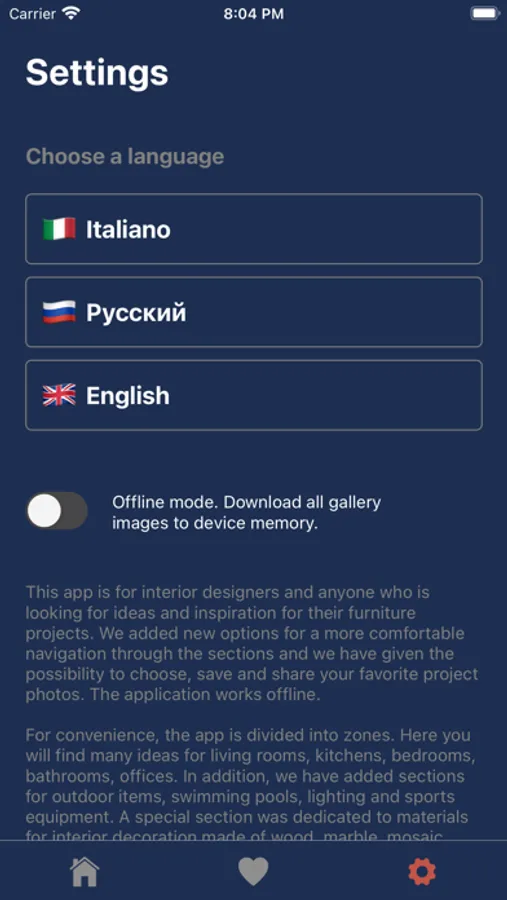 This app is for interior designers and anyone who is looking for ideas and inspiration for their furniture projects. We added new options for a more comfortable navigation through the sections and we have given the possibility to choose, save and share your favorite project photos. The application works offline.