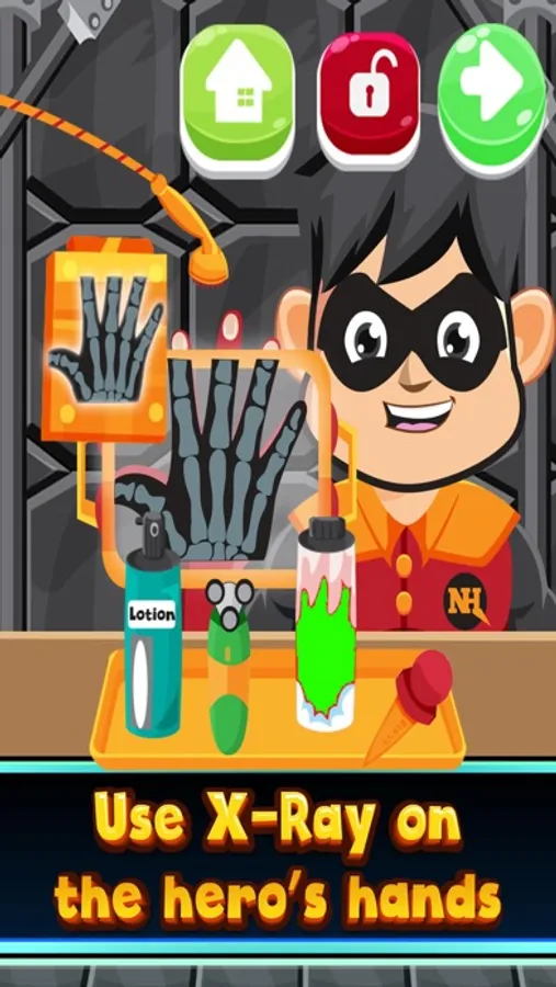 Choose from 6 superheroes and use exciting technology such as X-Rays and the latest medical equipment such as super lotion to heal their hands!
