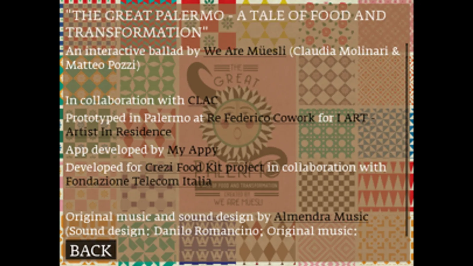 "The Great Palermo - A Tale of Food and Transformation" is an interactive ballad about street food, folklore and culture of the city of Palermo, Sicily. Explore the places and play with the stories, from Donna Florio's iris to Saint Rosalia's babbaluci: 19 secrets to discover in a visual novel by We Are Müesli in collaboration with CLAC. Soundtrack by Almendra Music, mobile development by My Appy.