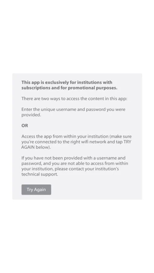 *** There are two ways to access the content in this app: Enter the unique username and password you were provided OR access the app from within your institution (make sure you're connected to the right wifi network).