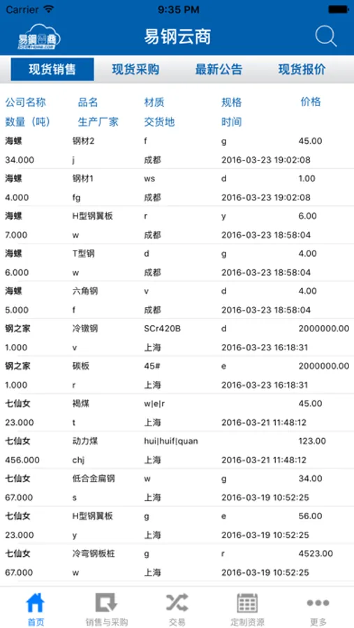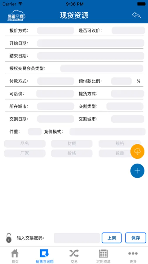 易钢云商iPhone手机应用主要包含用户登陆、资源(现货采购资源、现货销售资源)发布,查询,交易,以及现货报价、关于我们等。