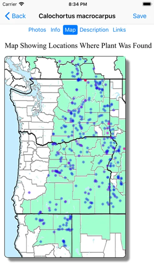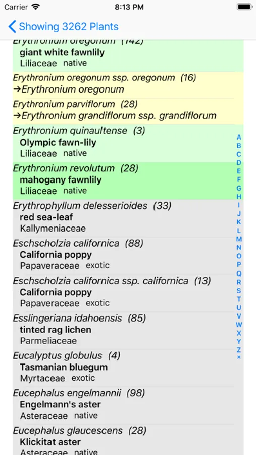 The App includes 3,510 species of plants found in Washington. Overall, 1,899 are "Wildflowers", 258 are shrubs, 114 are broadleaf trees, 31 are conifers, 32 are vines, 453 are grass-like, 94 are fern-like, 298 are moss-like, 113 are seaweed and 318 are lichen.