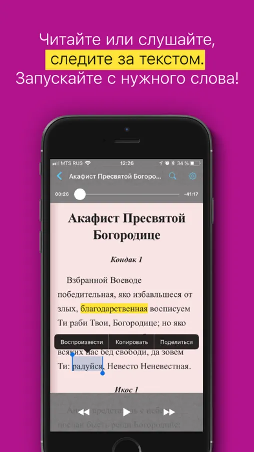 ・Воспроизведение с выбранного слова при помощи долгого касания;
