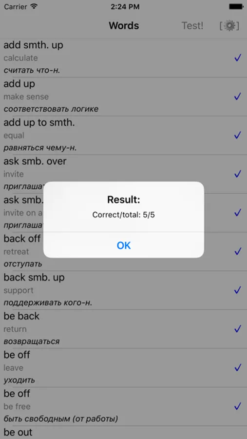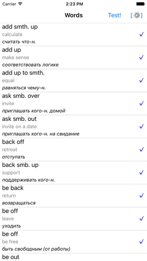 Это приложение поможет легко выучить фразовые глаголы английского языка с помощью уведомлений, отображаемых через настраиваемые промежутки времени, а также теста, который поможет проверить свои знания на выбранном количестве случайных слов. Полный список включает более 250 самых популярных английских фразовых глаголов с переводом на русский и словами-синонимами. По мере запоминания, с выученных выражений в списке можно снимать отметку показа, чтобы больше не получать их в уведомлениях и тесте.