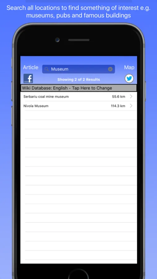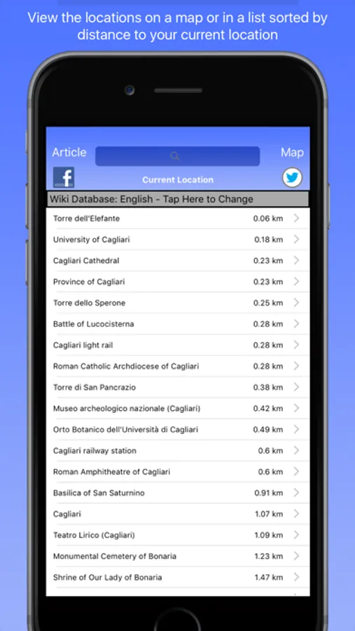 View the locations on a map or in a list sorted by distance to your location and then view the associated Wikipedia article. You can also do a search for a particular location.