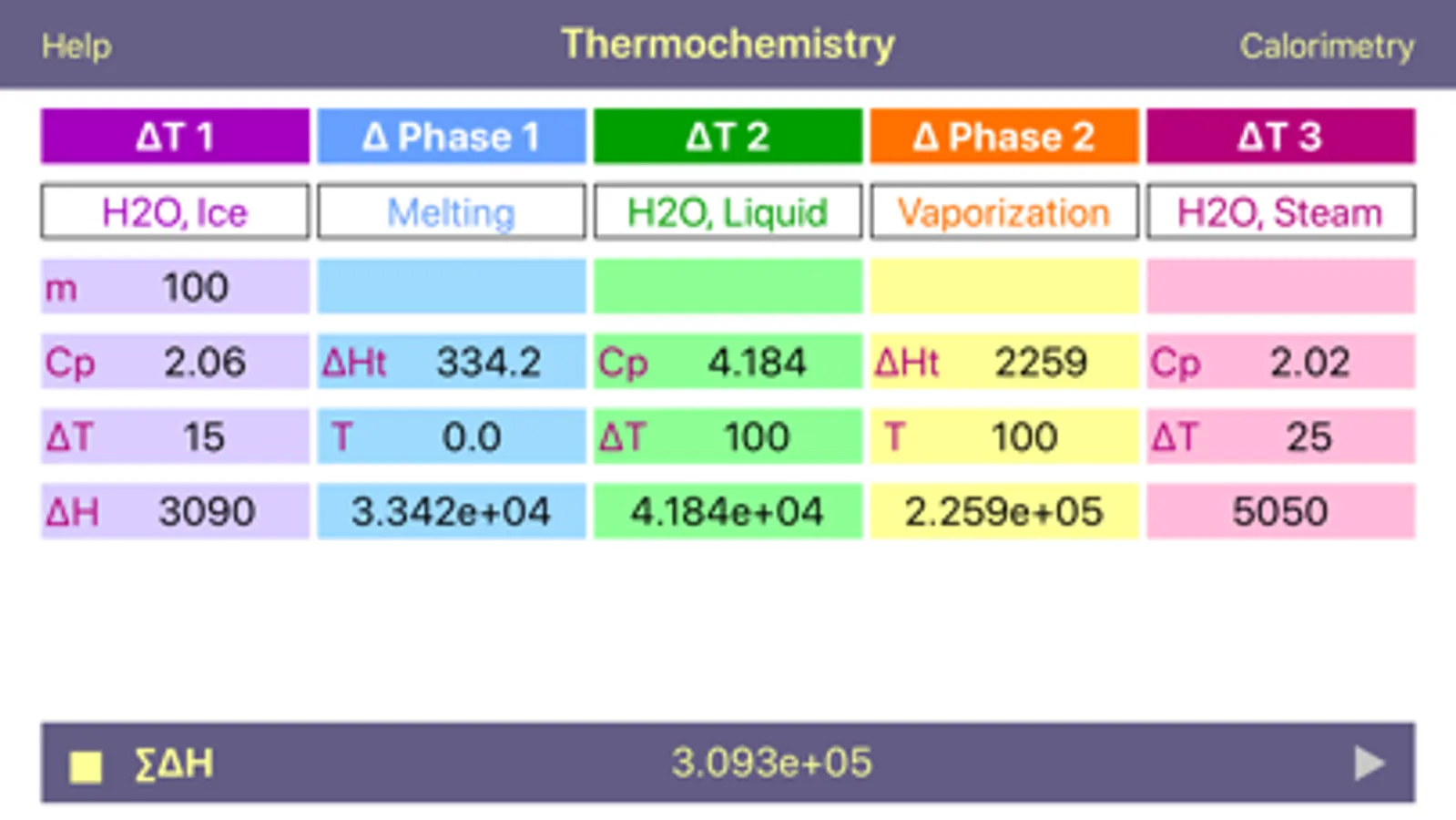 App provides enthalpy values for each step. Negative enthalpy points to exothermic process – heat release, while positive one to endothermic - heat absorption. °C and K are interchangeable.