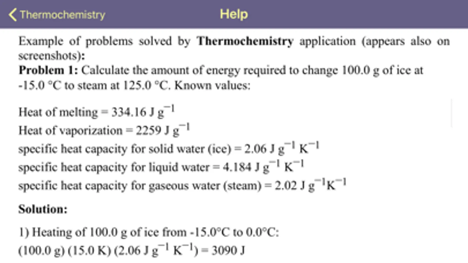 Problem 1: Calculate the amount of energy required to change 100.0 g of ice at -15.0 °C to steam at 125.0 °C. Known values: