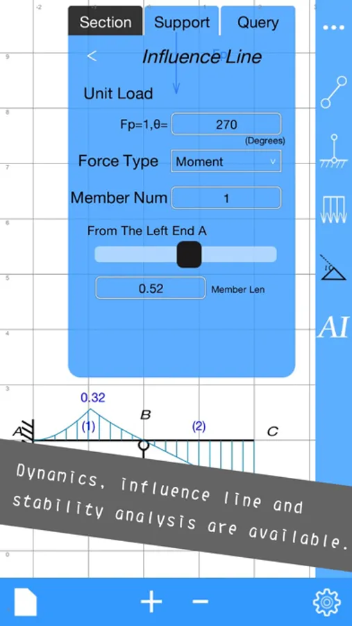 Powerful functions inside can deal with internal force diagram, dynamics, influence line and stability analysis.