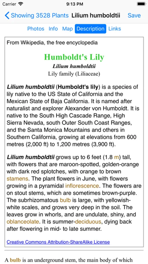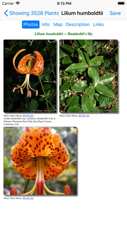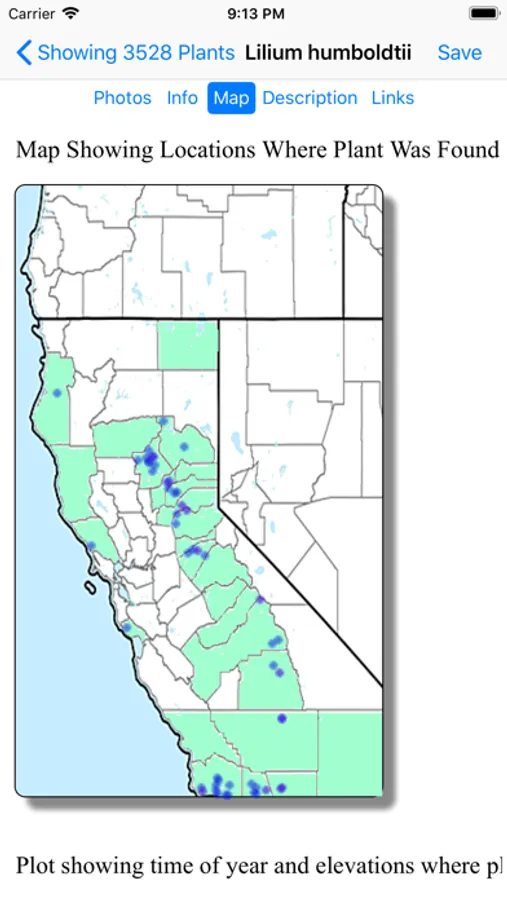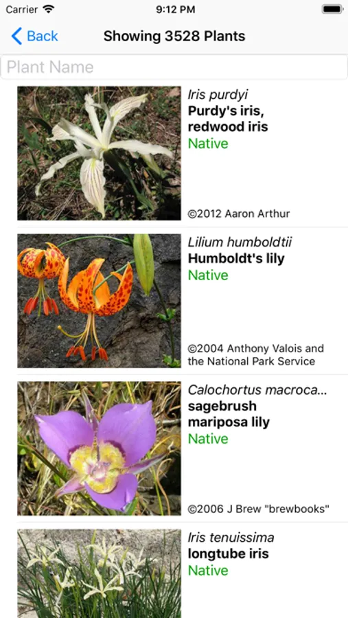 The App includes 3,866 species of plants found in North California. Overall, 2,384 are "Wildflowers", 301 are shrubs, 123 are broadleaf trees, 41 are conifers, 33 are vines, 488 are grass-like, 70 are fern-like, 211 are moss-like, 96 are seaweed and 234 are lichen.