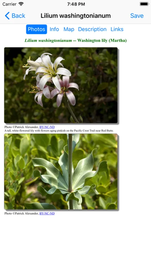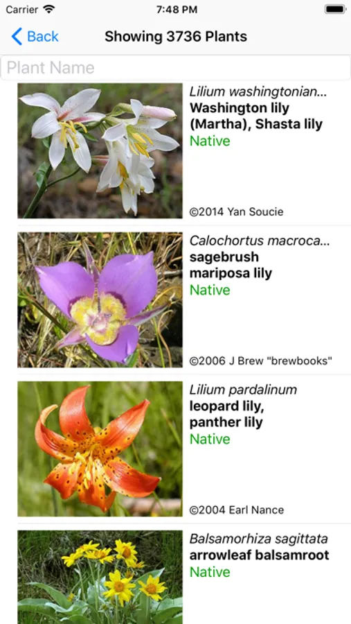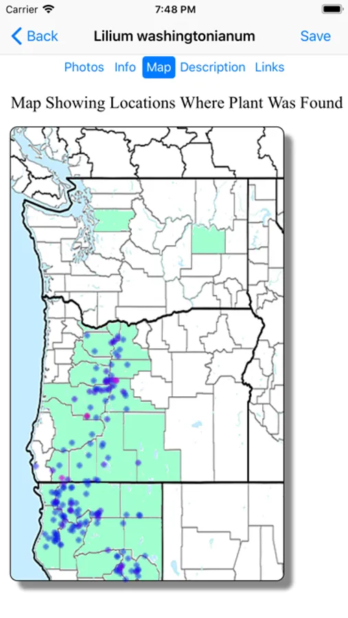 The App includes 4,071 species of plants found in Oregon. Overall, 2,451 are "Wildflowers", 309 are shrubs, 121 are broadleaf trees, 38 are conifers, 29 are vines, 477 are grass-like, 85 are fern-like, 262 are moss-like, 104 are seaweed and 298 are lichen.