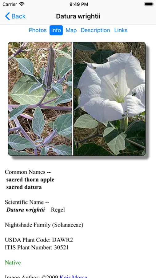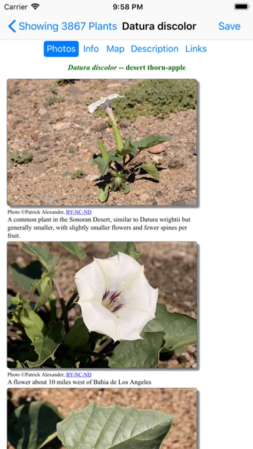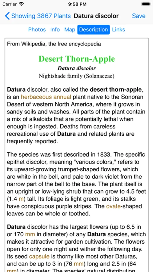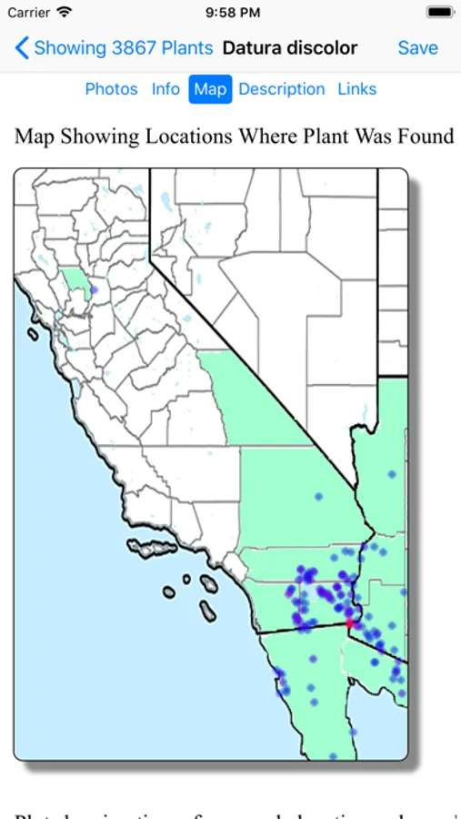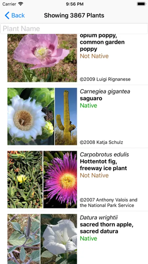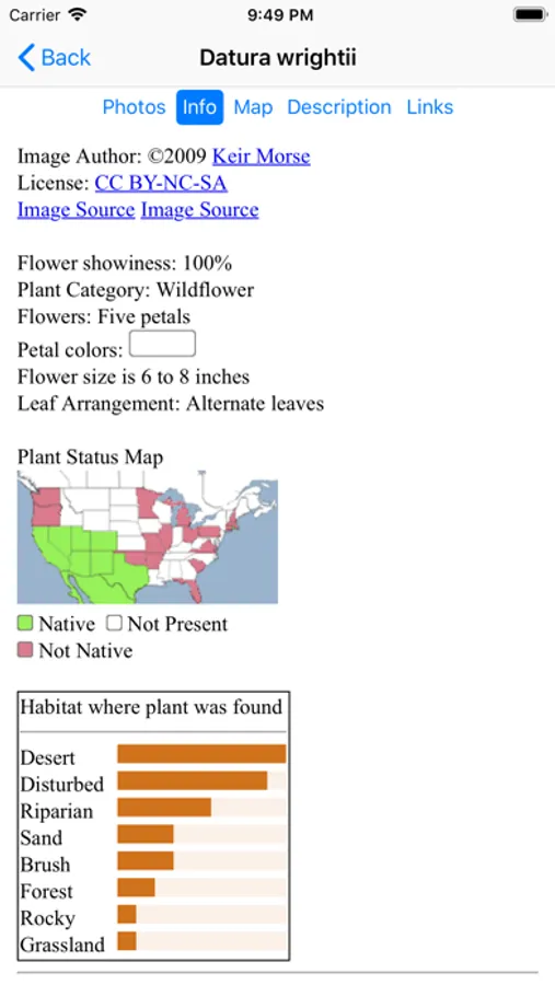 The App includes 4,216 species of plants found in the South California area. Overall, roughly 2,636 are "Wildflowers", 499 are shrubs, 186 are broadleaf trees, 41 are conifers, 43 are vines, 32 are cactus, 438 are grasses and sedges, 73 are ferns, 242 are lichen, 113 are moss and 98 are seaweed.