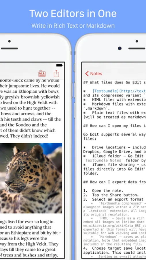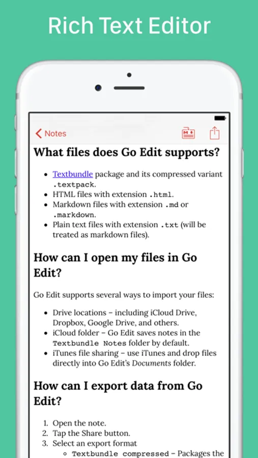 Introducing Go Edit. Write in markdown *or* rich text and easily switch between those formats. Add in photos or pictures easily from other apps and Go Edit would happily handle it. When you're ready to share, send your documents in HTML with embedded images that can be opened in any app.