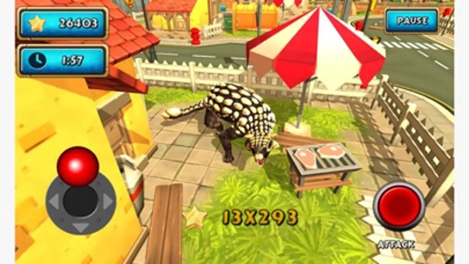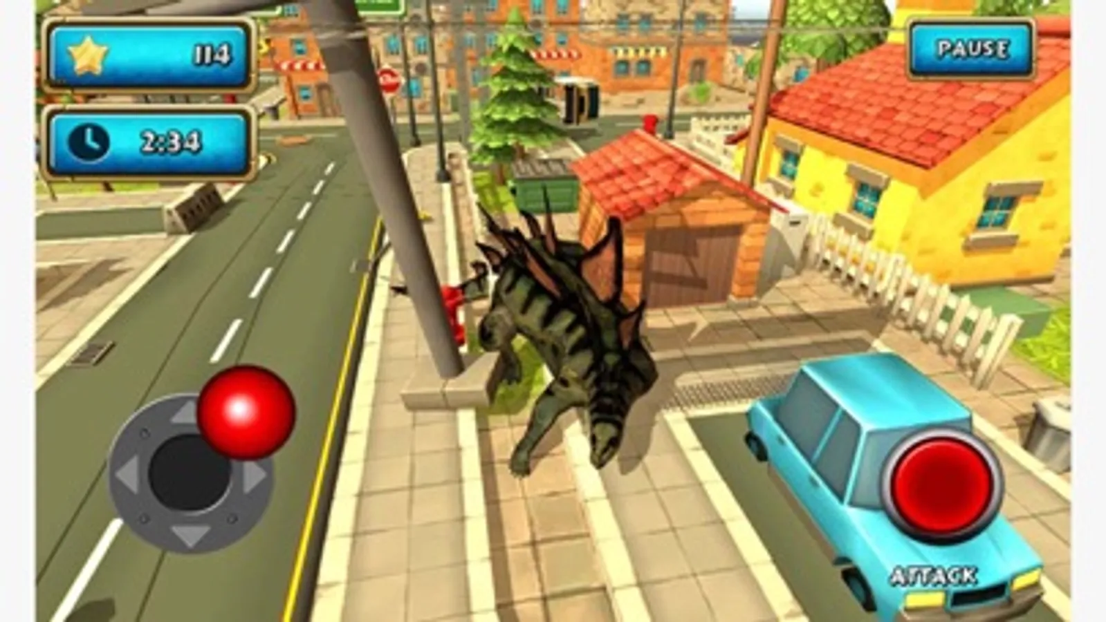 Dinosaur sim is action, casual adventure game, where you play as a crazy, angry, frenzy and stupid prehistoric dino in city. Your aim is to cause destruction, mess, wreck, demolish, ram, smash everything interactive and also annoy citizens. In your mission you gain points and experience, the faster you get them the more bonus you recieve. Town environment contains a lot of obstacles such as explosive cars, pixel fence, barrels, block lawns, streetlights, street hydrants, cube dustbins and many other.