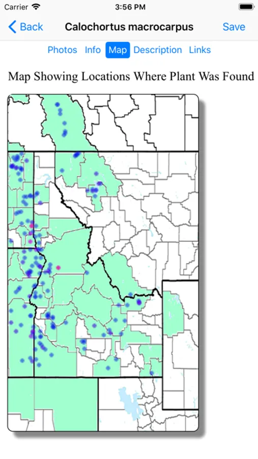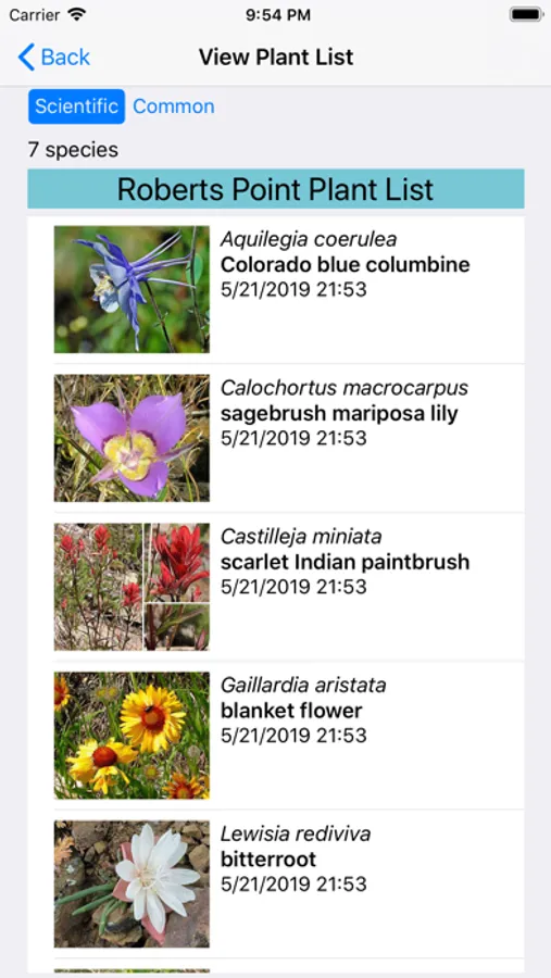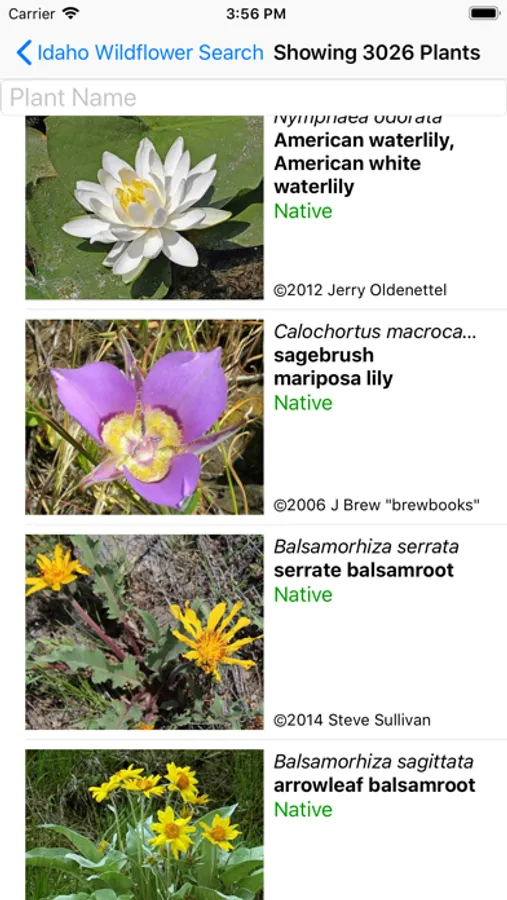 The App includes 3,259 species of plants found in Idaho. Overall, 1,930 are "Wildflowers", 227 are shrubs, 103 are broadleaf trees, 26 are conifers, 20 are vines, 7 are cactus, 449 are grass-like, 79 are fern-like, 225 are moss-like, and 281 are lichen.