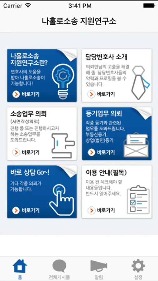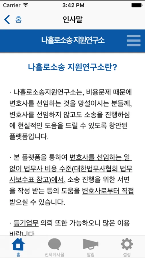- 본 어플리케이션은 서면작성, 등기업무 의뢰를 최우선적으로 처리하고 있으므로, 단순한 법률상담에 대해서는 응답을 하지 않거나 응답이 늦어질 수 있으니, 양해해주시기 바랍니다.