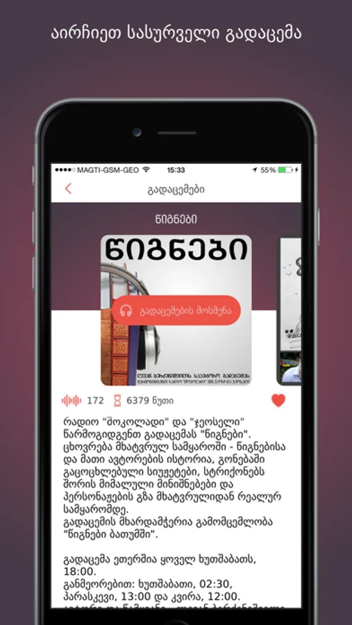 * Listen to the radio broadcast live on all locations where you have access to the Internet;