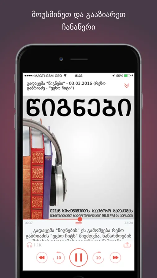 * While listening a record you can forward or backward it, read the content of a record and if you wish, share it with friends or public;