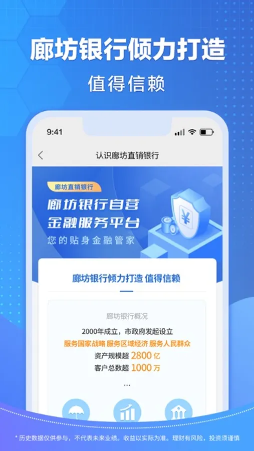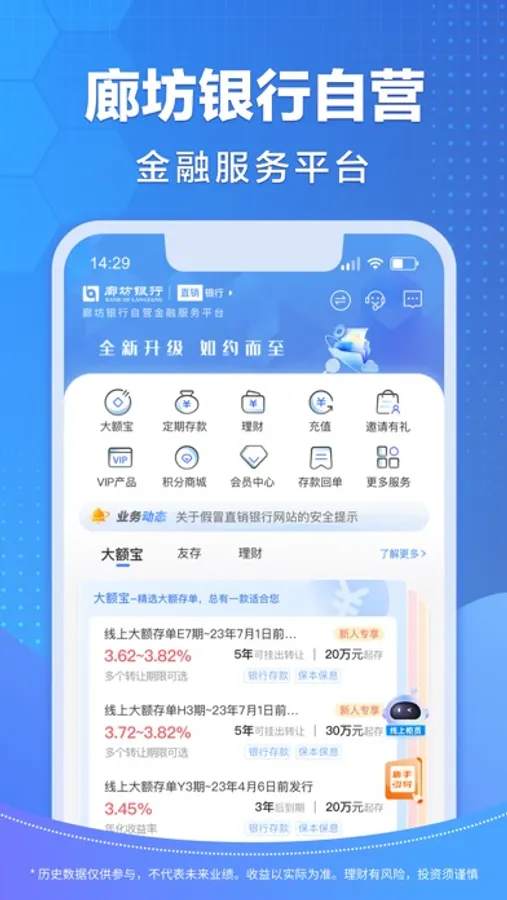廊坊直销银行是廊坊银行打造的纯线上金融服务平台,致力于为互联网客户提供简易、专属、有趣的存款、理财、贷款及权益服务。