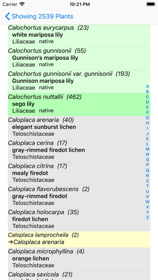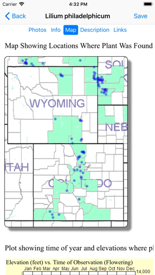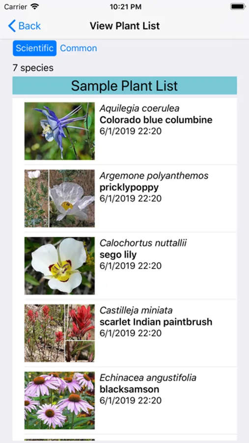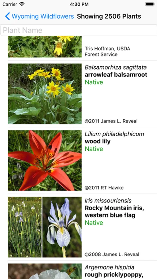The App includes 2,691 species of plants found in Wyoming. Overall, 1,633 are "Wildflowers", 167 are shrubs, 56 are broadleaf trees, 15 are conifers, 14 are vines, 7 are cactus, 397 are grass-like, 50 are fern-like, 177 are moss-like, and 224 are lichen.