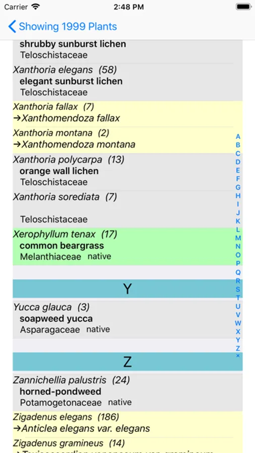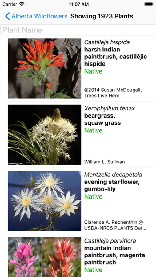 The App includes 2,754 species of plants found in Alberta. Overall, 1,367are "Wildflowers", 195 are shrubs, 65 are broadleaf trees, 27 are conifers, 12 are vines, 408 are grass-like, 87 are fern-like, 325 are moss-like, and 327 are lichen.