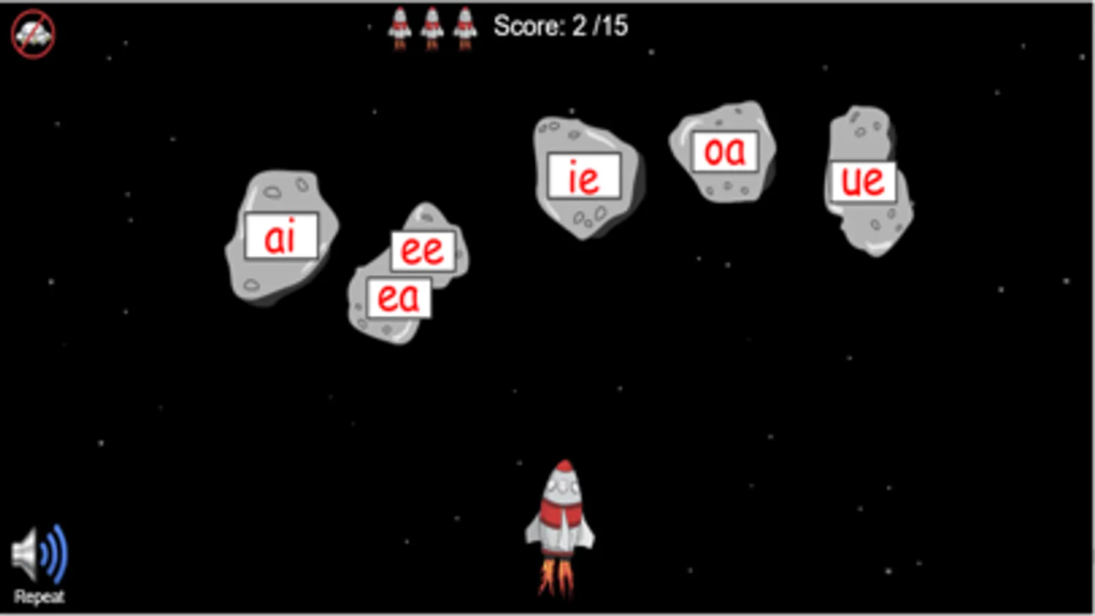 The child will identify the short vowel in a word that is called out, (s)he will blow up the asteroid with the corresponding long vowel sound. An alien spaceship will come along to try and destroy the player's ship, so (s)he better watch out!