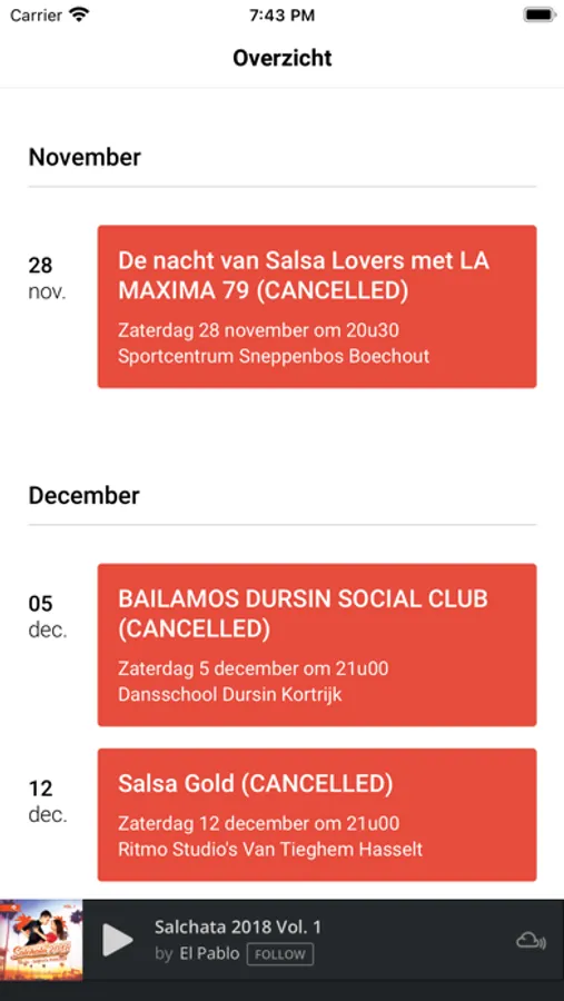 De Salsa evenementenlijst met al de evenementen uit Vlaanderen gerangschikt op datum, overzichtelijk per kleur volgens organisator en gekoppeld aan google maps met route planner.