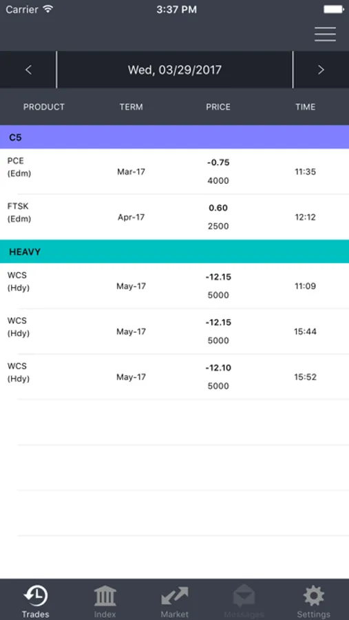 Traders can filter by product preference and/or search by company trades with an ‘S’ or ‘B’ to indicate whether your company bought or sold on the trade.