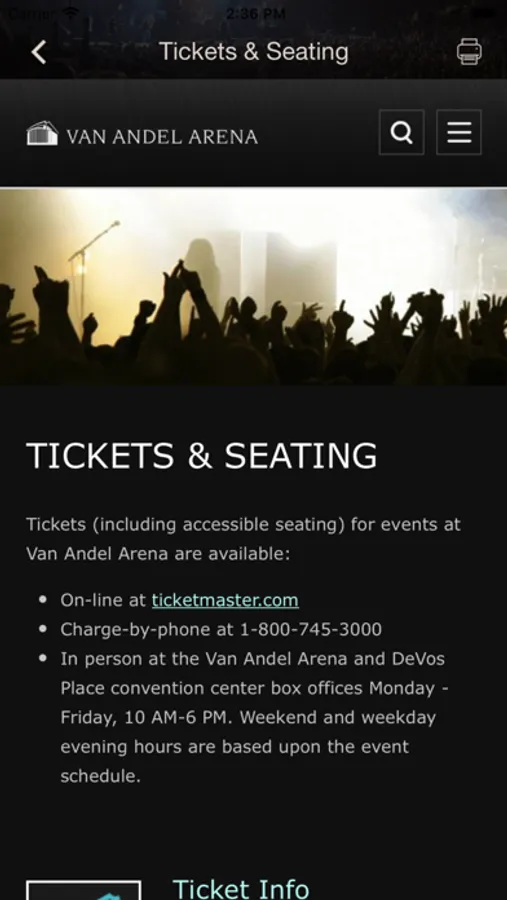 • Tickets & Seating- See what type of seating and tickets are available