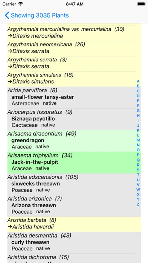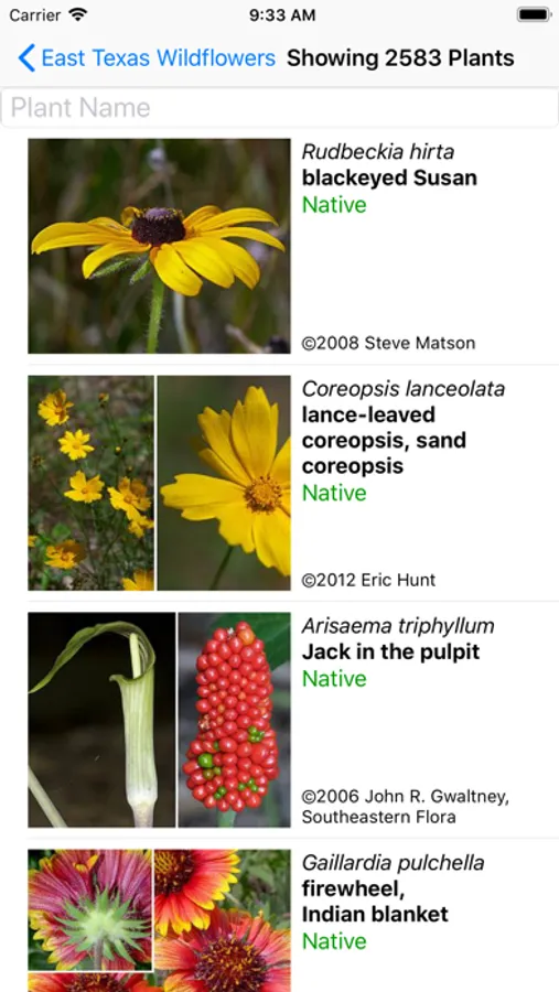 The App includes 3,604 species of plants found in East Texas. Overall, 2,007 are "Wildflowers", 356 are shrubs, 286 are broadleaf trees, 20 are conifers, 130 are vines, 21 are cactus, 603 are grass-like, 77 are fern-like, 144 are moss-like, 26 are seaweed and 168 are lichen.