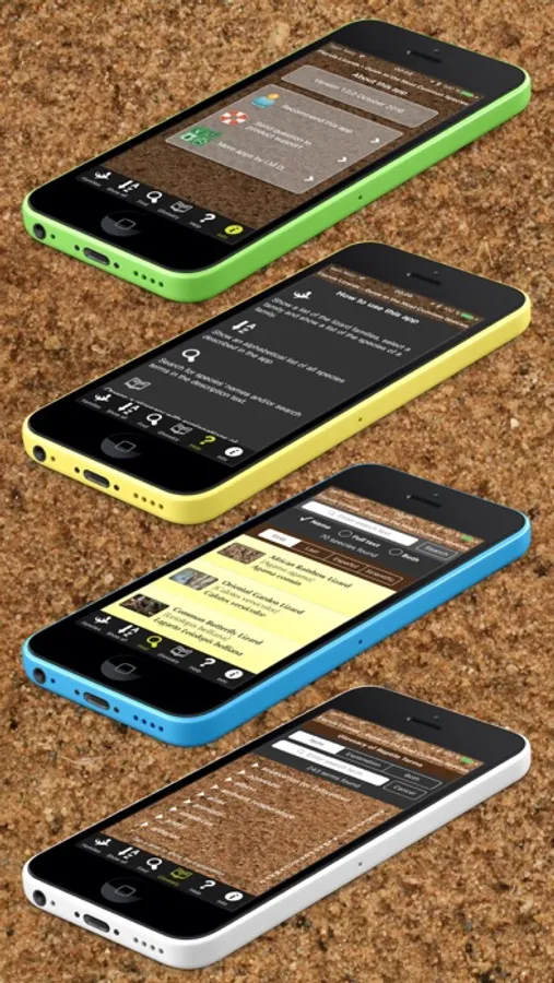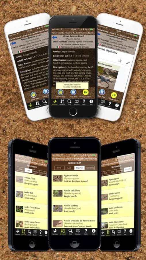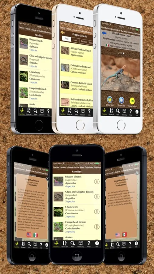 This app shows 70 lizard species found in Florida, including the Everglades National Park and the Gulf and Atlantic coast. For each animal there are two or more high-resolution pictures, a brief description, and a link to view the corresponding Wikipedia pages within the application window. All descriptive information is in English, the animal names are also shown in scientific (Latin) denomination and most of them in Spanish.
