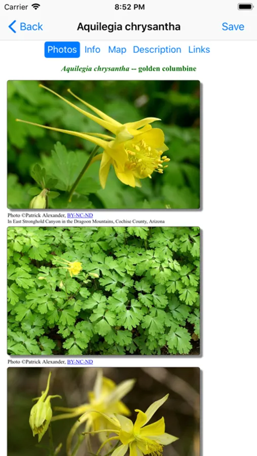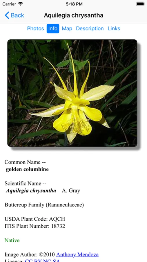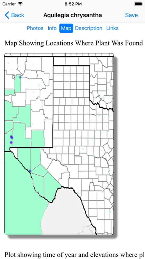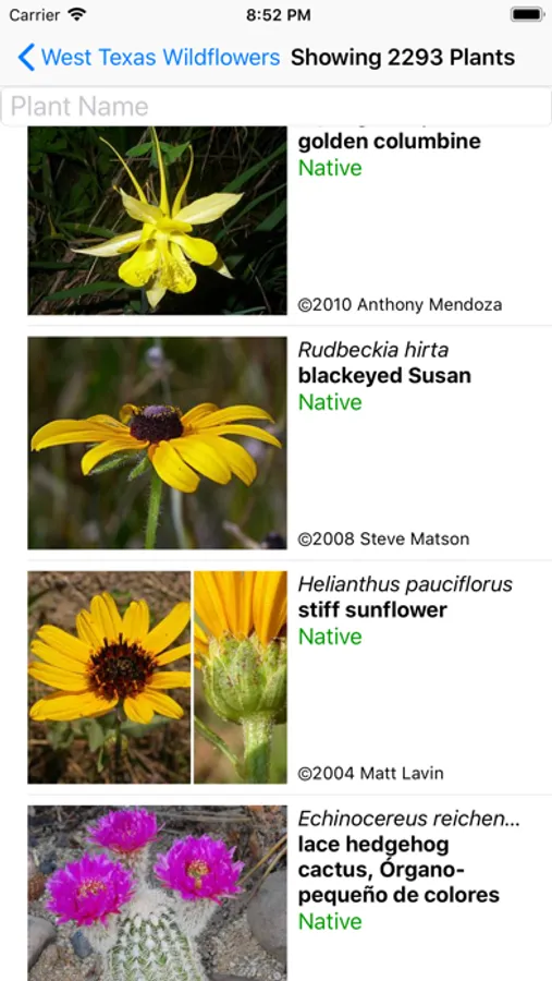 The App includes 3,198 species of plants found in West Texas. Overall, 1,852 are "Wildflowers", 339 are shrubs, 216 are broadleaf trees, 26 are conifers, 101 are vines, 41 are cactus, 444 are grass-like, 77 are fern-like, 102 are moss-like, and 197 are lichen.