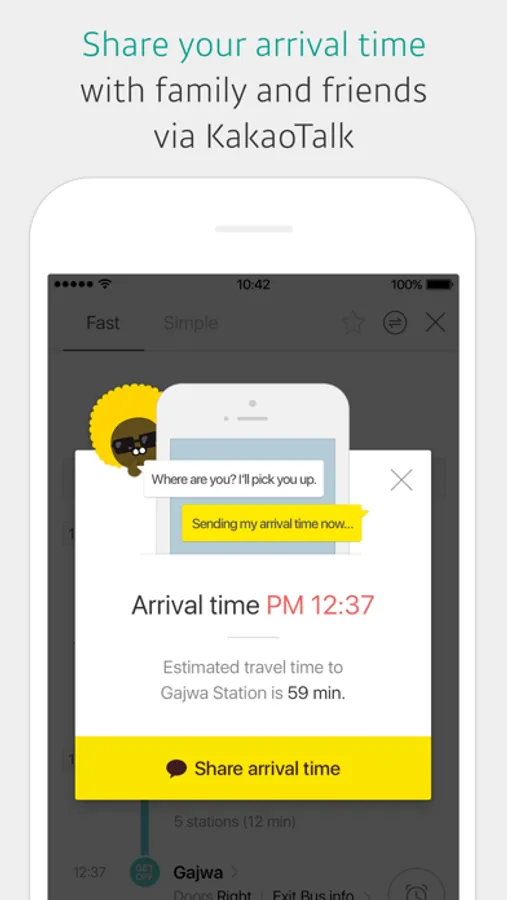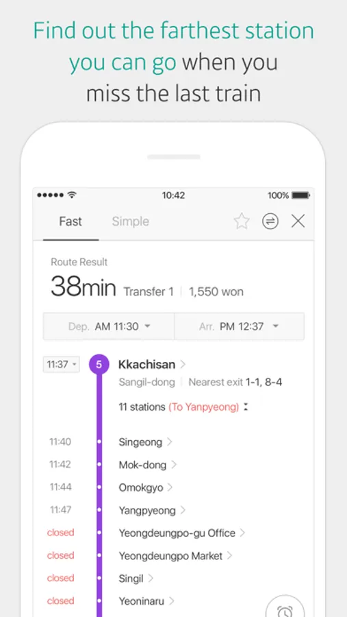 KakaoMetro shows you the fastest routes to your destination as of the current time.