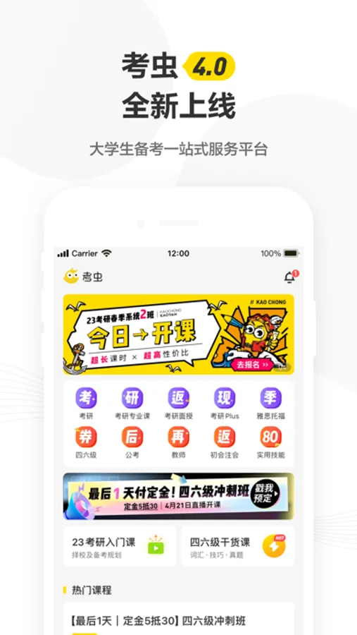 考虫是大学生备考一站式服务平台,专注大学四六级考试、考研公共课考试、考研专业课考试、公考国考、教师资格考试、雅思考试和实用英语学习的课程,提供完整的学习图书资料大礼包、配套学习课程、模拟考试、随堂测试、能力评估报告、课后答疑等考试学习的完整解决方案。