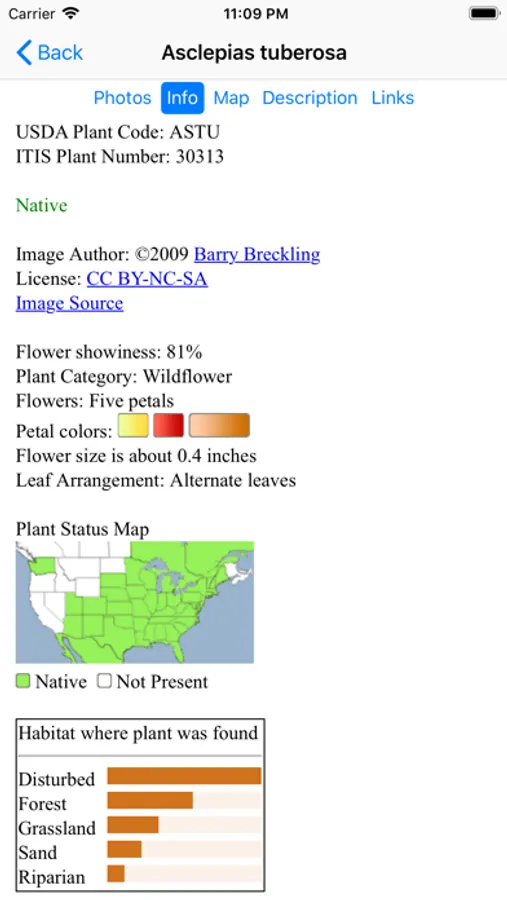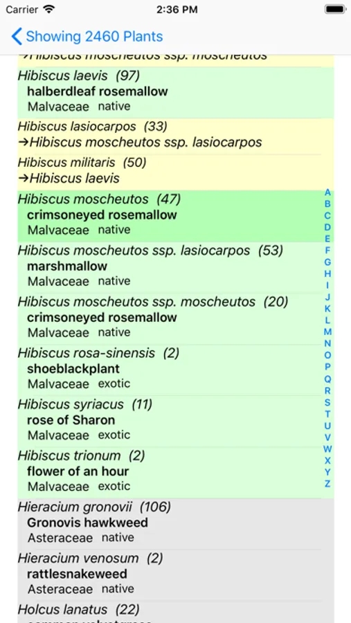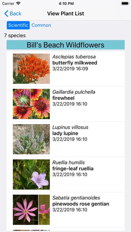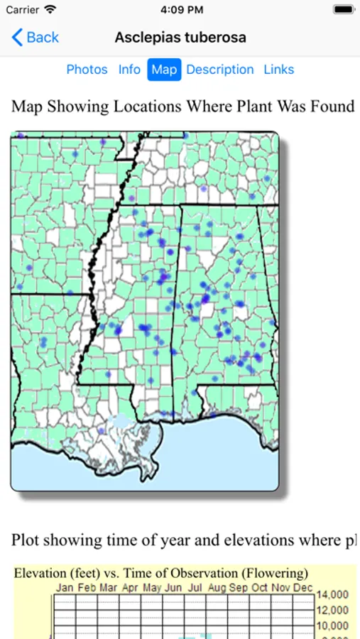 The App includes 2,773 species of plants found in Mississippi. Overall, 1,525 "Wildflowers", 221 are shrubs, 226 are broadleaf trees, 13 are conifers, 95 are vines, 4 are cactus, 544 are grasses and sedges, 55 are ferns, 97 are lichen, 135 are moss and 5 are seaweed.