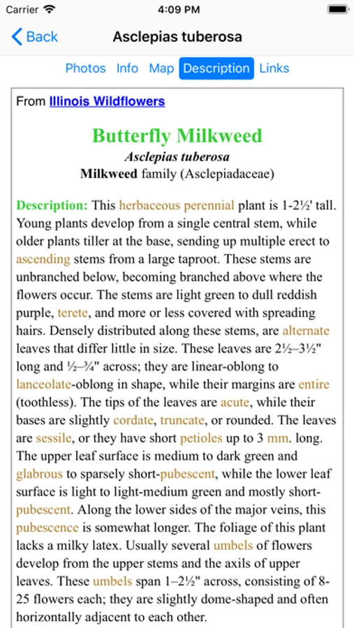 This App helps find and identify plants. When you give the App information about a plant, such as its location, flower color and the time of year, the App will quickly show you which plants match your selections.