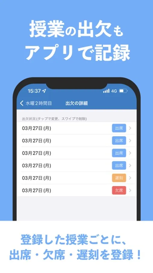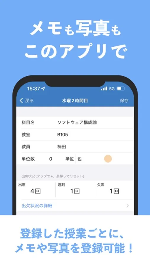 - 各科目で、科目名、教官、教室、色分け、出席回数、遅刻回数、欠席回数、休講情報、メモの登録、写真の貼り付け