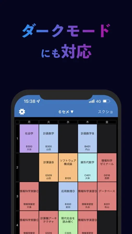 - 複数の時間割に対応。複数の時間割を保存・切り替え可能(切り替えは画面上部の「時間割」をタップ)