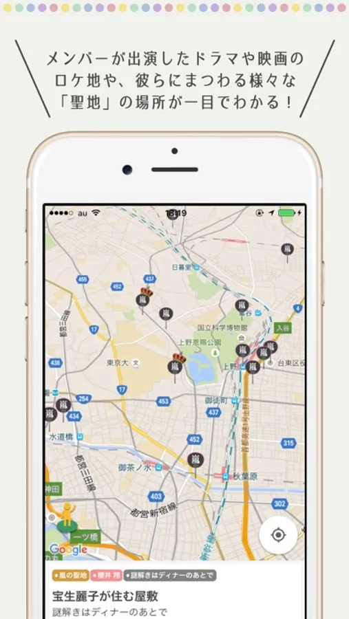当アプリは書籍『嵐の聖地』(ISBN978-4865370096)や『嵐の深イイ話』(978-4904676790)など10数冊の嵐関連本をもとにスマホ用に作成したサービスとなります。