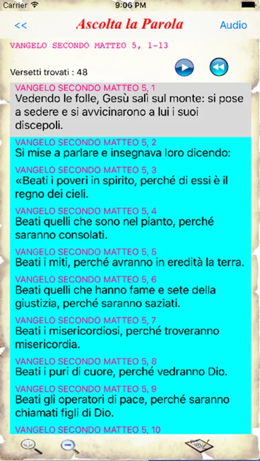 Ci sono funzioni di zoom-in e zoom-out per il testo, la possibilità di salvare la parola negli appunti per esportarla in altre applicazioni. L'audio può essere customizzato a piacere. La lettura può essere interrotta e ripresa dallo stesso punto o riportata all'inizio del capitolo o iniziata da un qualsiasi versetto con un semplice click.