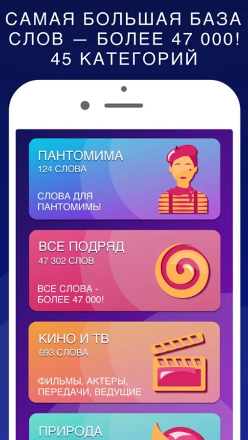 Стартовый набор, Детский, Микс, Пантомима, Животные, Все слова, Простые слова, Взрыв мозга, Семейный, Знаменитости, Кино и ТВ, Мультфильмы, Путешествия, Еда, Спорт, Литература, Искусство, Музыка, Наука, Словосочетания, Тренды, Бренды, Природа, Дом и быт, Профессии, Школа, Хобби, Пантомима - Сложный, Знаменитости - Сложный, Кино и ТВ - Сложный, Литература - Сложный, Музыка - Сложный, Sport - Сложный, Искусство - Сложный, Наука - Сложный, Путешествия - Сложный, Транспорт, Изобретения, Технологии, Мужчины, Женщины, Человек, Лето, Новый год, Гардероб